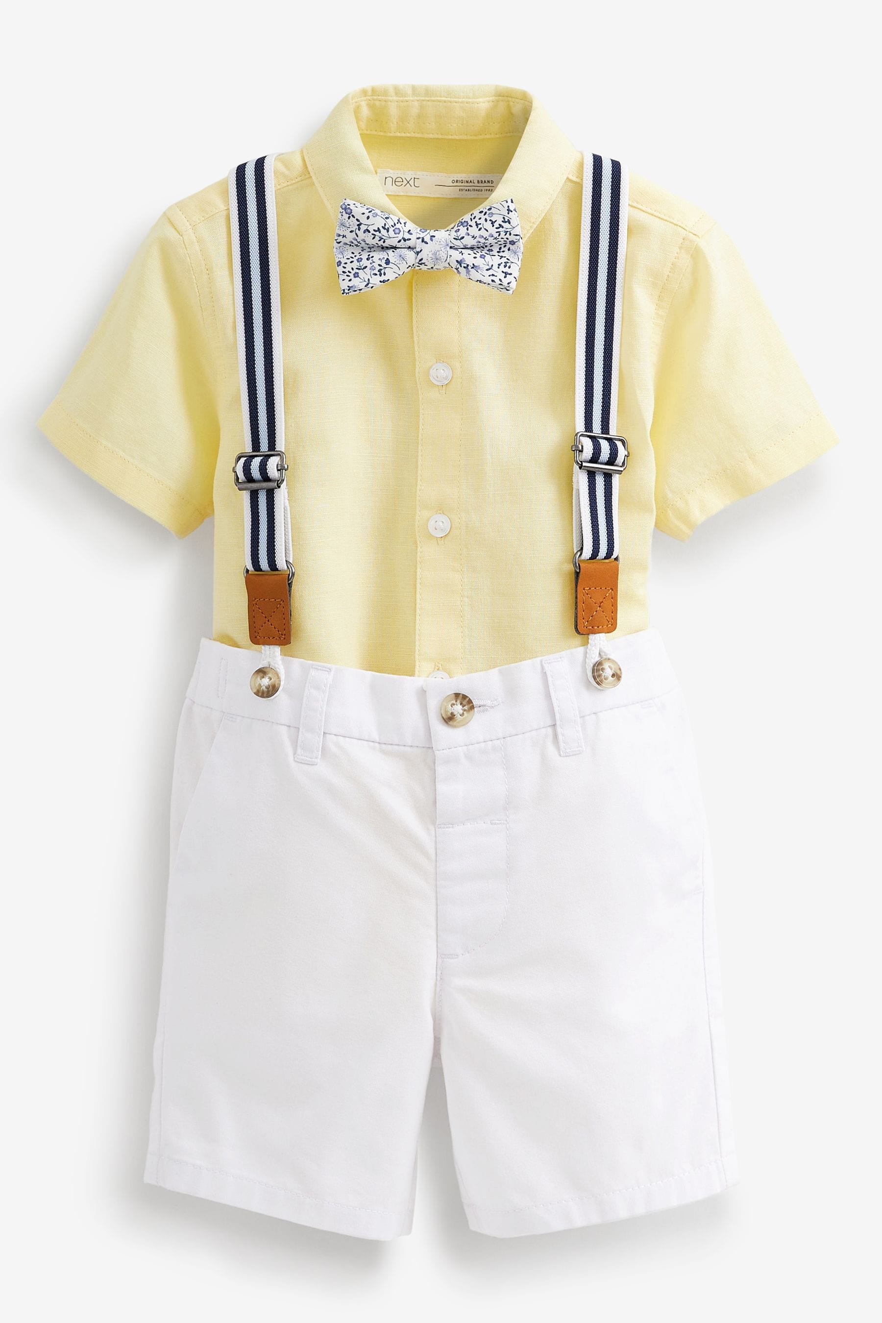 黃色恤衫、白色短褲、吊帶和蝴蝶結領帶套裝
